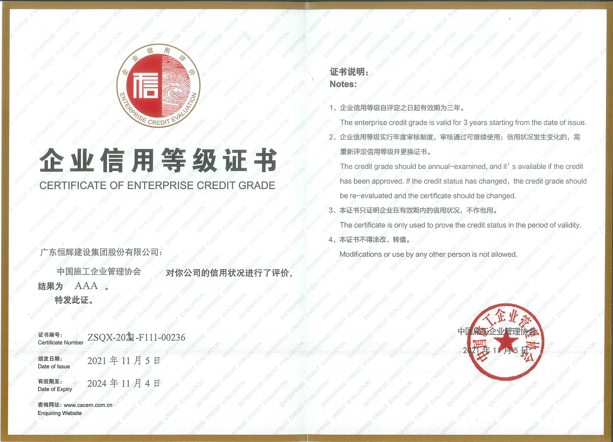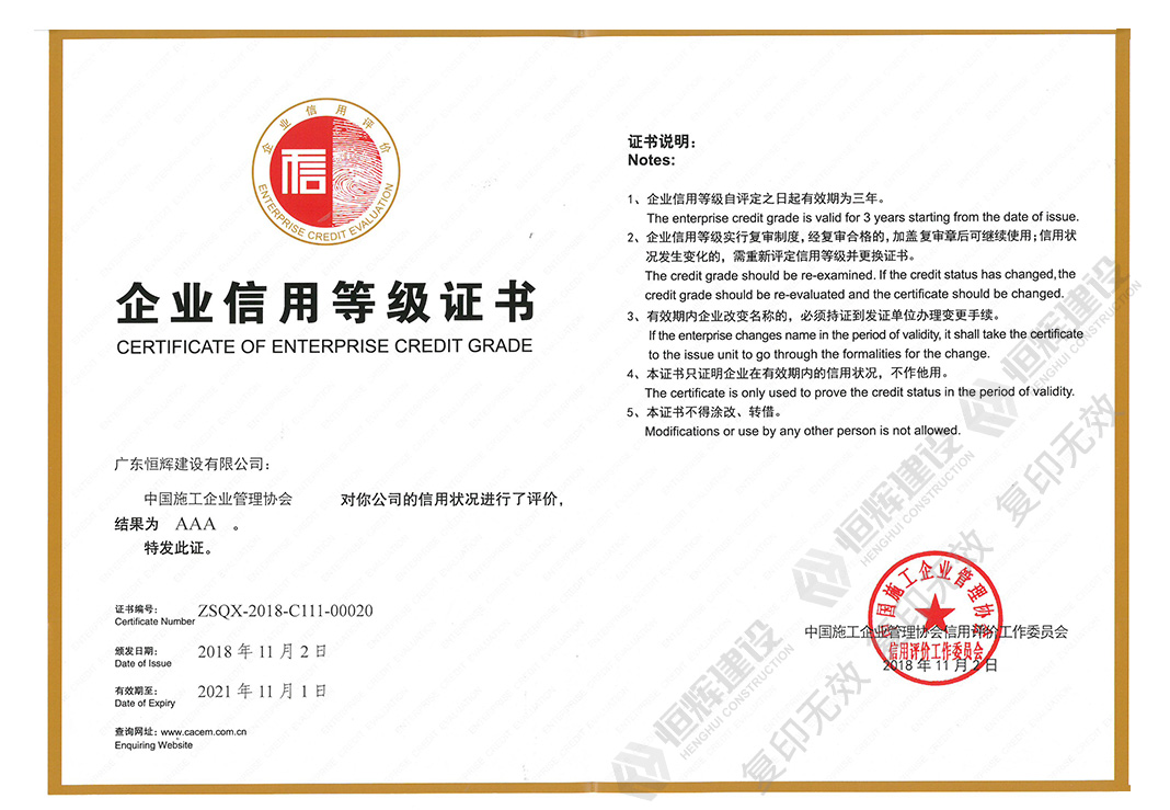 “中國施工企業(yè)信用等級AAA”、“全國建筑業(yè)AAA級信用企業(yè)證書”