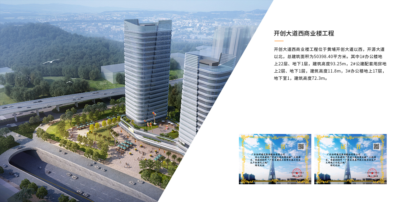 開創(chuàng)大道西商業(yè)樓工程位于黃埔開創(chuàng)大道以西,開源大道以北,總建筑面積為50398.40平方米。其中1#辦公樓地上22層、地下1層,建筑高度93.25m,2#公建配...