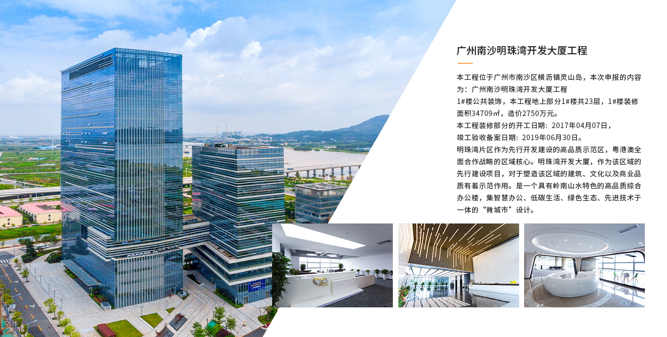 本工程位于廣州市南沙區(qū)橫瀝鎮(zhèn)靈山島,本次申報的內容為:廣州南沙明珠灣開發(fā)大廈工程 1#樓公共裝飾,本工程地上部分1#樓共23層,1#樓裝修面積34709㎡...