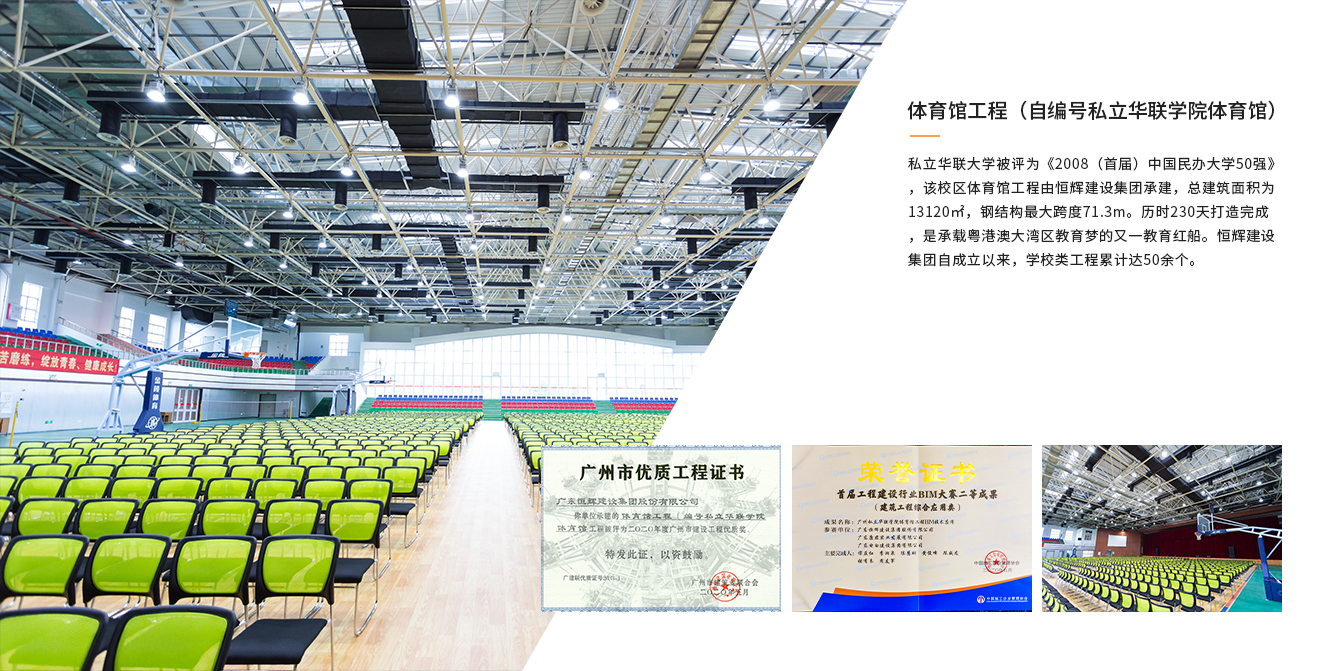 私立華聯(lián)大學被評為《2008(首屆)中國民辦大學50強》,該校區(qū)體育館工程由恒輝建設集團承建,總建筑面積為13120㎡,鋼結構最大跨度71.3m。歷時230天...